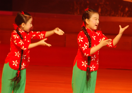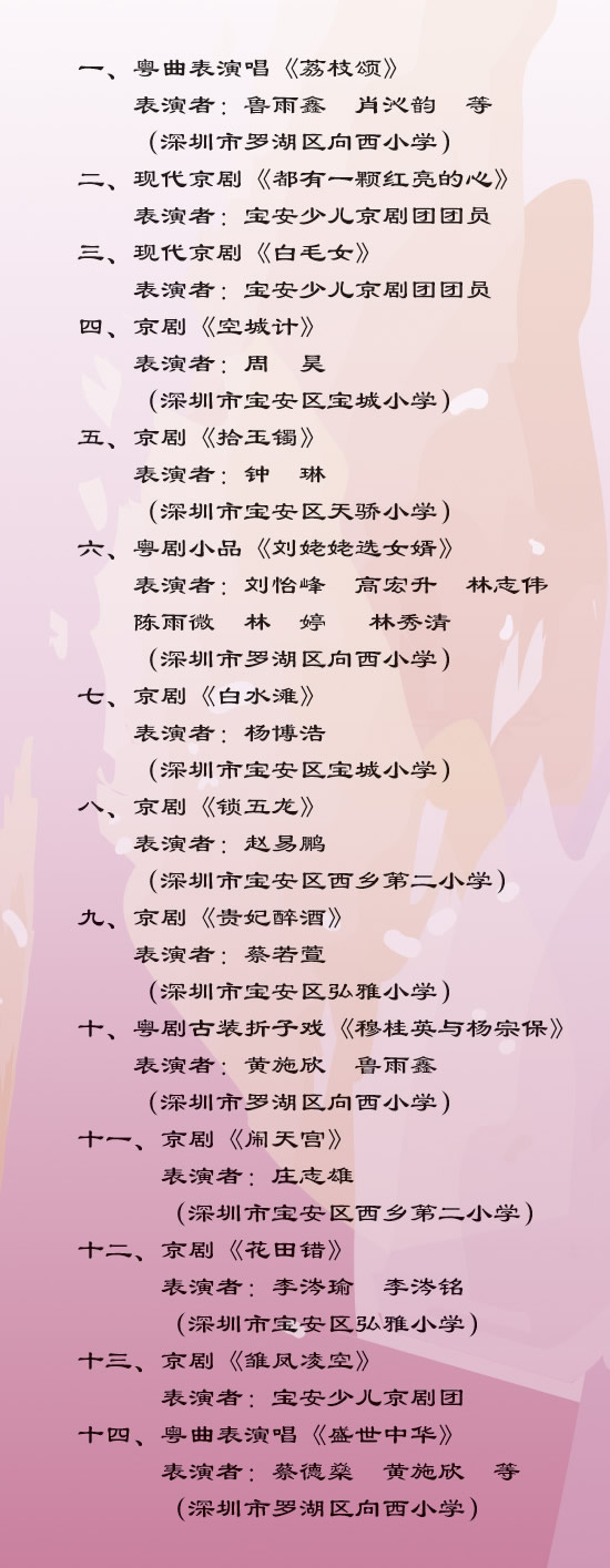 整场演出由京剧和粤剧唱段组成,十四个节目形式多样,有现代京剧《都有一颗红亮的心》、《白毛女》,有传统经典剧目《空城计》、《白蛇传》,有粤剧古装折子戏《穆桂英与杨宗保》,也有小品《刘姥姥选女婿》,和粤曲表演唱《盛世中华》和《荔枝颂》等。小演员们唱念做打,一招一式都有板有眼,赢得孩子阵阵赞赏。无论老生、武生,还是花旦、青衣,小演员们有的唱腔字正腔圆,声情并茂,表演逼真细腻,真切感人;有的大气磅礴、虎虎生风,唱腔慷慨激昂,表演舒展大方,武打演员动作伶俐敏捷,又富有气魄,表现细致。演员们精湛的表现力和表演功底令人惊讶和佩服,场上掌声不断。据了解,台上多位小演员曾获得全国少儿戏曲最高奖项“小梅花”金奖,包括《空城计》的周昊、《锁五龙》的赵易鹏和《挂画》的范子缇等。