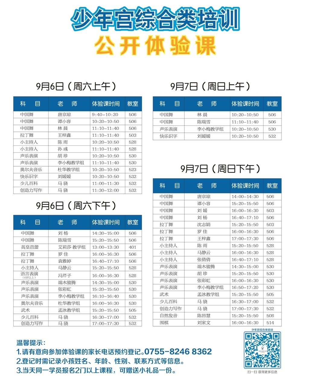 市少年宫五楼综合类培训于9月6日、7日开设免费公开体验课,欢迎家长和学员参加。详询82468362。