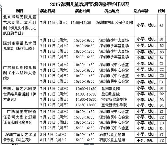 为进一步推进素质教育,提升少年儿童的艺术审美情操,丰富暑期及课余生活,市委宣传部、市文体旅游局、市教育局、将携手中国儿童艺术剧院等专业剧院,于7月11日-8月11日举办以“启迪童心,成就未来”为主题的2015中国深圳儿童戏剧节活动,届时来自国内知名儿童剧团中国儿童艺术剧院、北京缤纷无限儿童艺术剧团、广西演出有限责任公司、广东话剧院将倾情上演经典童话剧《伊索寓言》、儿童系列剧《锛儿头小辫儿之疯狂的节日》、大型奇幻童话音乐剧《魔豆》、儿童剧《小八路和大俘虏》;深圳童话艺术团带来本土原创童话音乐剧《秘密山谷》与改编音乐童话剧《马兰花》。