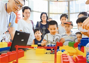 深圳特区报讯(记者 李舒瑜)一个由小朋友操控的航模飞碟腾空而起,飞向主席台。市委常委、组织部长张虎拿下飞碟搭载的卷轴,朗声宣布:2013深圳青少年科学与艺术节正式开幕!这是昨天上午,记者在市少年宫看到的一幕。 简短的开幕式后,3万多名儿童相聚在这里,参加各种科学与艺术活动,放飞自己的梦想,欢庆“六一”。市政协副主席张效民出席活动。 此次活动以“中国梦,深圳梦”为主题,将持续到9月份,陆续推出22个大项、30多个小项的活动,为孩子们插上梦想的翅膀。 昨天在市少年宫,不少活动已经展开。在水晶大厅里,机器人嘉年华活动正在火热进行,机器人不仅会走路,还会投篮、歌唱、跳舞。孩子们在老师的指导下,体验组装并运用机器人的乐趣。在展厅举办的“了解星空,探索宇宙”天文图片展中,天文专家和志愿者带领孩子们了解星空的知识。 玩是儿童的天性,跳房子、立体迷宫、幻影3D立体艺术、让熊猫“飞”等活动让孩子们在游戏中启迪创造,打开想象,走进科学与艺术的殿堂。