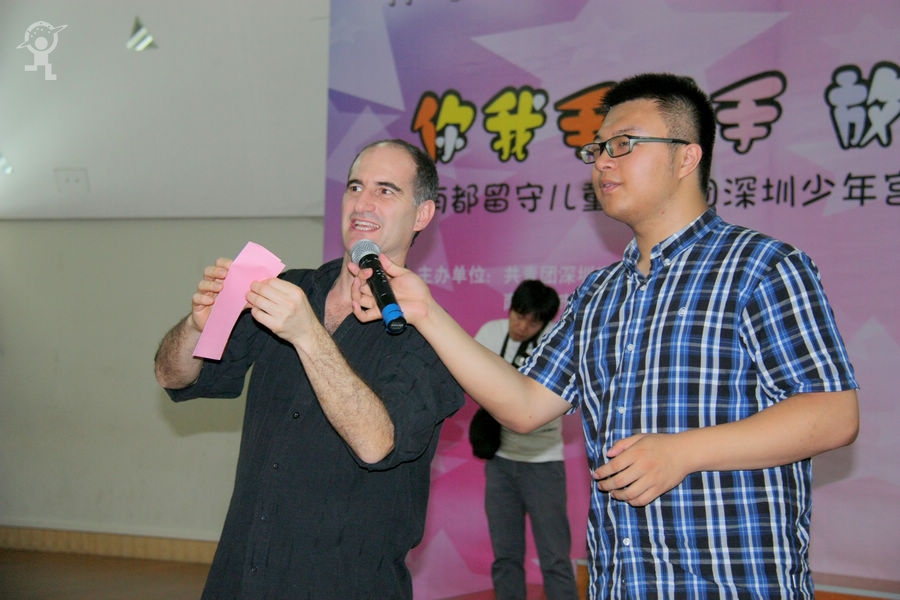 为了活跃气氛,拉近留守儿童与深圳孩子的距离,昨日上午的活动从做游戏开始。音乐响起,所有孩子被主持人邀请上台,大家手牵手围成一个圈,按照顺时针方向跑起来,主持人说出一个数字,然后孩子们就抱在一起加出那个数字,抱错的被淘汰,这既是测试大家的反应能力,更是测试他们的团队合作精神。没想到,两地孩子完全没有隔阂,他们一起手牵着手,围着圈跳,大家亲如一家人,即使有的小组出错被淘汰,大家也没有互相埋怨。