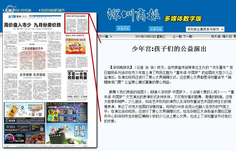 群舞《我们美丽的祖国》、朗诵《深圳梦·中国梦》、小合唱《爱的人间》……“童年颂·中国梦”文艺演出的表演形式多种多样,不仅有好看的歌舞、激情的朗诵,还有太极拳和相声。少儿朋友、知名艺术机构的演员以及深圳市童话艺术团的师生们的倾情表演,表达了对伟大祖国的深情祝福,现场的500多名观众也融入在热烈的气氛之中。在演出活动现场,还进行了爱心文具捐赠仪式,给龙华新区大浪街道水围社区服务中心和深圳市龙华新区横朗小学的少儿送上爱心文具,也送上了深圳童话节对他们的关爱。