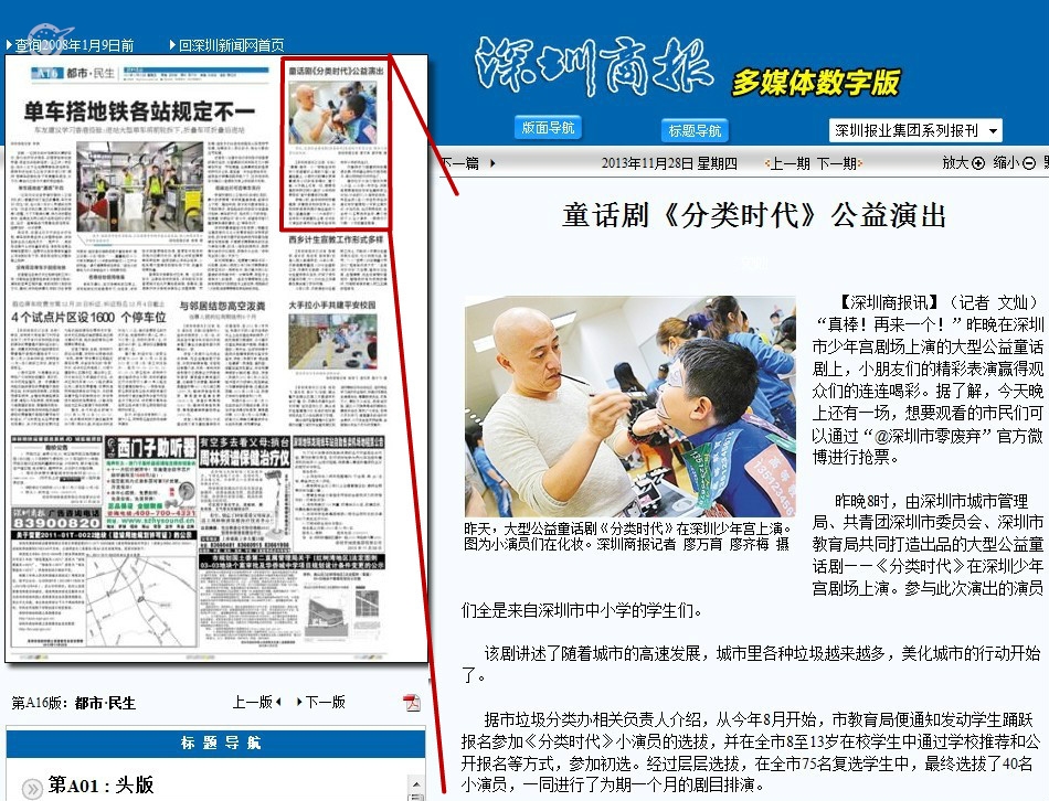 昨晚8时,由深圳市城市管理局、共青团深圳市委员会、深圳市教育局共同打造出品的大型公益童话剧——《分类时代》在深圳少年宫剧场上演。参与此次演出的演员们全是来自深圳市中小学的学生们。