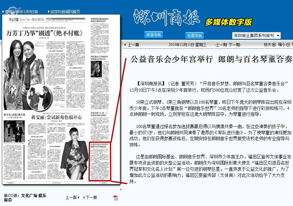 〖深圳商报〗公益音乐会少年宫举行 郎朗与百名琴童合奏