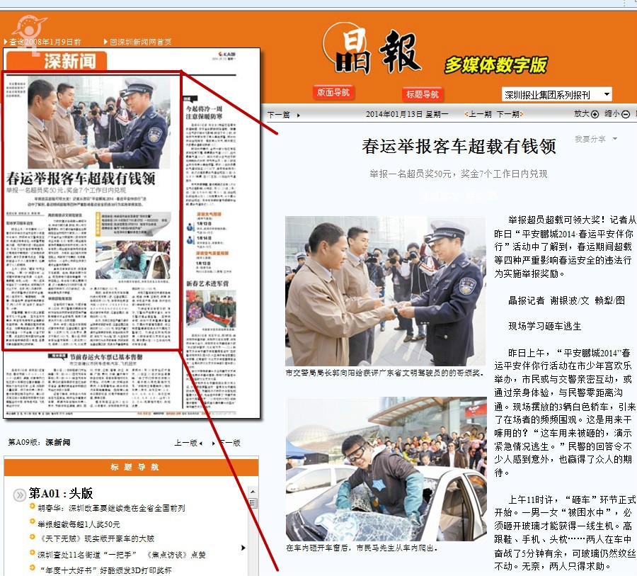 举报超员超载可领大奖!记者从昨日“平安鹏城2014·春运平安伴你行”活动中了解到,春运期间超载等四种严重影响春运安全的违法行为实施举报奖励。