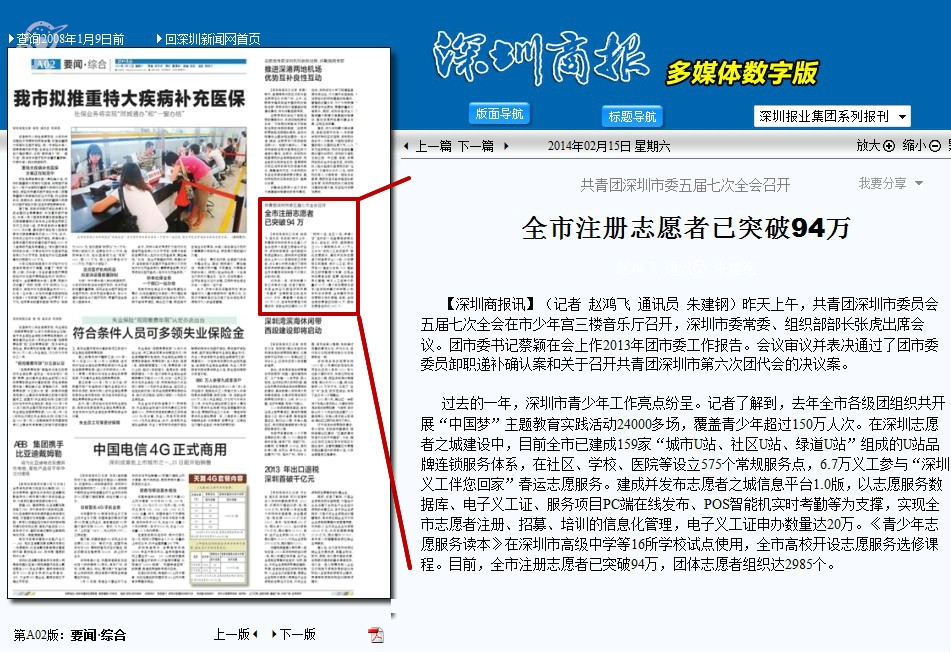 过去的一年,深圳市青少年工作亮点纷呈。记者了解到,去年全市各级团组织共开展“中国梦”主题教育实践活动24000多场,覆盖青少年超过150万人次。在深圳志愿者之城建设中,目前全市已建成159家“城市U站、社区U站、绿道U站”组成的U站品牌连锁服务体系,在社区、学校、医院等设立575个常规服务点,6.7万义工参与“深圳义工伴您回家”春运志愿服务。建成并发布志愿者之城信息平台1.0版,以志愿服务数据库、电子义工证、服务项目PC端在线发布、POS智能机实时考勤等为支撑,实现全市志愿者注册、招募、培训的信息化管理,电子义工证申办数量达20万。《青少年志愿服务读本》在深圳市高级中学等16所学校试点使用,全市高校开设志愿服务选修课程。目前,全市注册志愿者已突破94万,团体志愿者组织达2985个。
