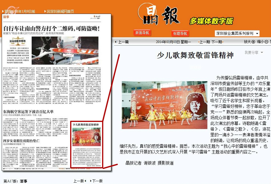 为传播弘扬雷锋精神,由中共深圳市委宣传部等主办的“欢乐童年”假日剧场昨日在市少年宫上演了两场共话雷锋精神的文艺演出,吸引了近千名学生和家长观看。“学习雷锋好榜样,忠于革命忠于党……”熟悉的旋律再次响起,全场观众伴着节奏一起放歌,拉开了此次演出的序幕。诗歌朗诵《雷锋》、《雷锋之歌》、《你,浪花里的一滴水》……表演者激情洋溢的朗诵,让现场的观众重温历史、缅怀先烈,真切的感受雷锋精神。据悉,本次活动主题为“我心中的雷锋精神”,也是我市正在开展的以文艺形式深入开展“学习雷锋”主题活动的重要内容之一。
