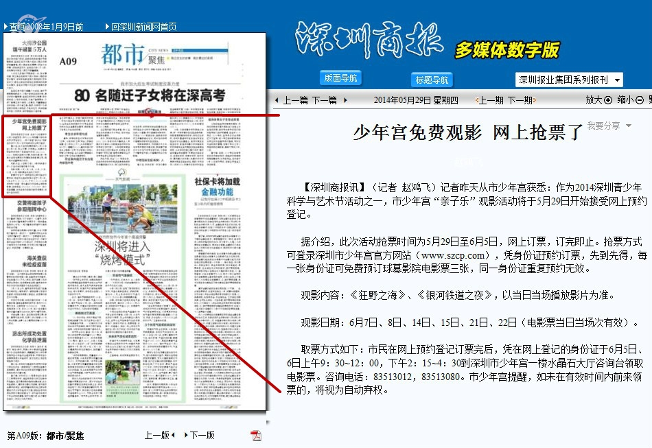 据介绍,此次活动抢票时间为5月29日至6月5日,网上订票,订完即止。抢票方式可登录深圳市少年宫官方网站(m.bnq8.com),凭身份证预约订票,先到先得,每一张身份证可免费预订球幕影院电影票三张,同一身份证重复预约无效。