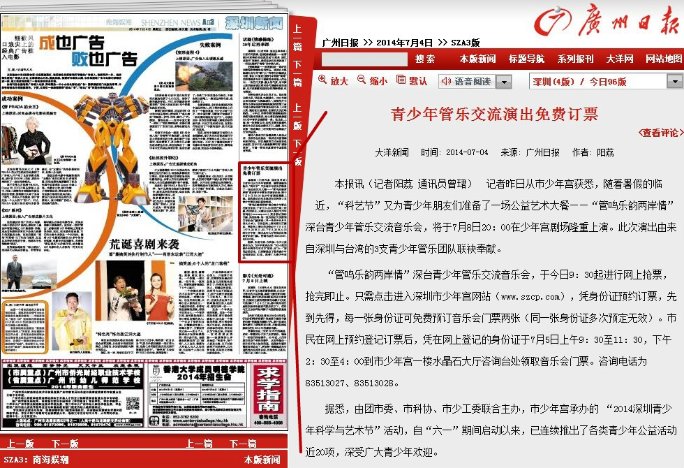“管鸣乐韵两岸情”深台青少年管乐交流音乐会,于今日9:30起进行网上抢票,抢完即止。只需点击进入深圳市少年宫网站(m.bnq8.com),凭身份证预约订票,先到先得,每一张身份证可免费预订音乐会门票两张(同一张身份证多次预定无效)。市民在网上预约登记订票后,凭在网上登记的身份证于7月5日上午9:30至11:30,下午2:30至4:00到市少年宫一楼水晶石大厅咨询台处领取音乐会门票。咨询电话为83513027、83513028。