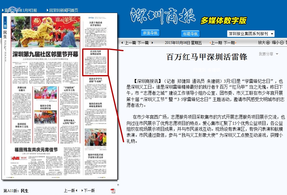 【深圳商报讯】(记者 郑健阳 通讯员 朱建钢)3月5日是“学雷锋纪念日”,也是深圳义工日。谁是深圳雷锋精神最好的践行者?百万“红马甲”当之无愧。昨日下午,市“志愿者之城”建设工作领导小组办公室、团市委、市义工联在市少年宫开展第十届“深圳义工节”暨“3·5学雷锋纪念日”主题活动,邀请市民感受文明城市的志愿者活力。