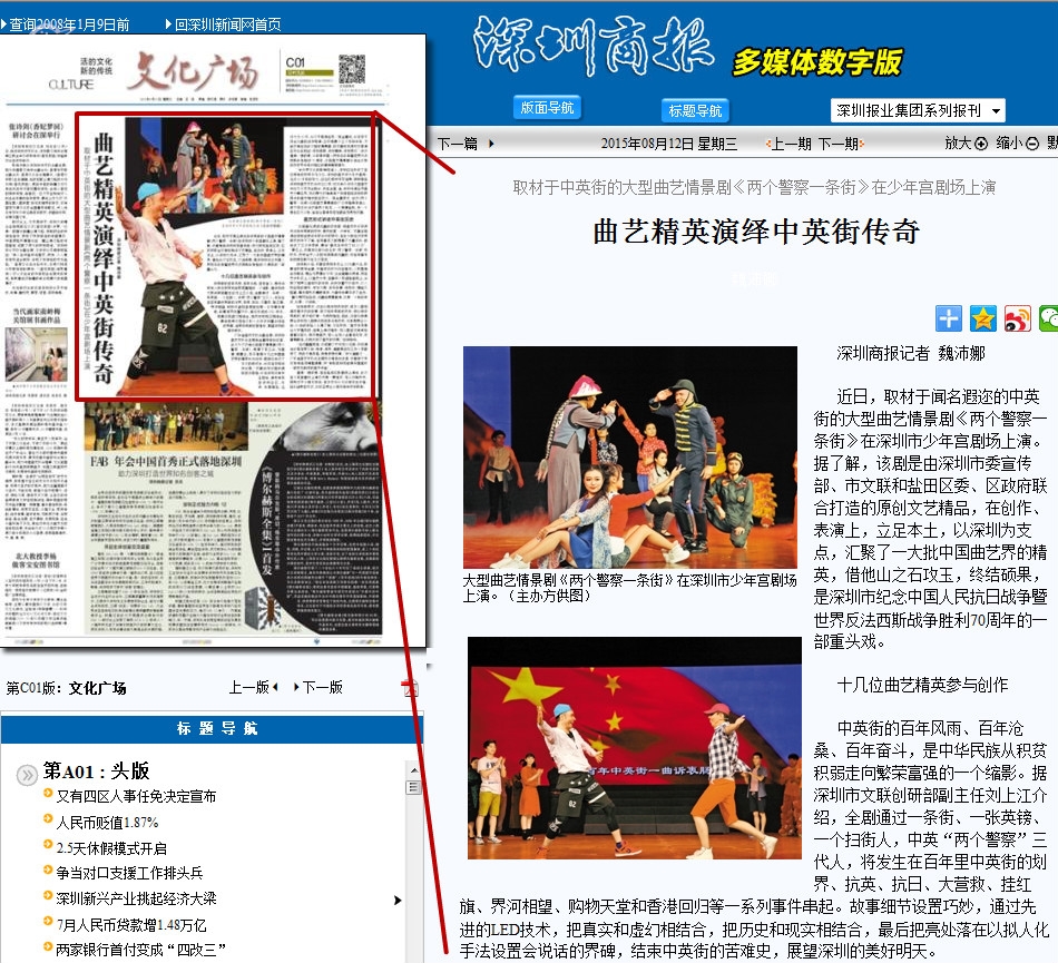 近日,取材于闻名遐迩的中英街的大型曲艺情景剧《两个警察一条街》在深圳市少年宫剧场上演。据了解,该剧是由深圳市委宣传部、市文联和盐田区委、区政府联合打造的原创文艺精品,在创作、表演上,立足本土,以深圳为支点,汇聚了一大批中国曲艺界的精英,借他山之石攻玉,终结硕果,是深圳市纪念中国人民抗日战争暨世界反法西斯战争胜利70周年的一部重头戏。