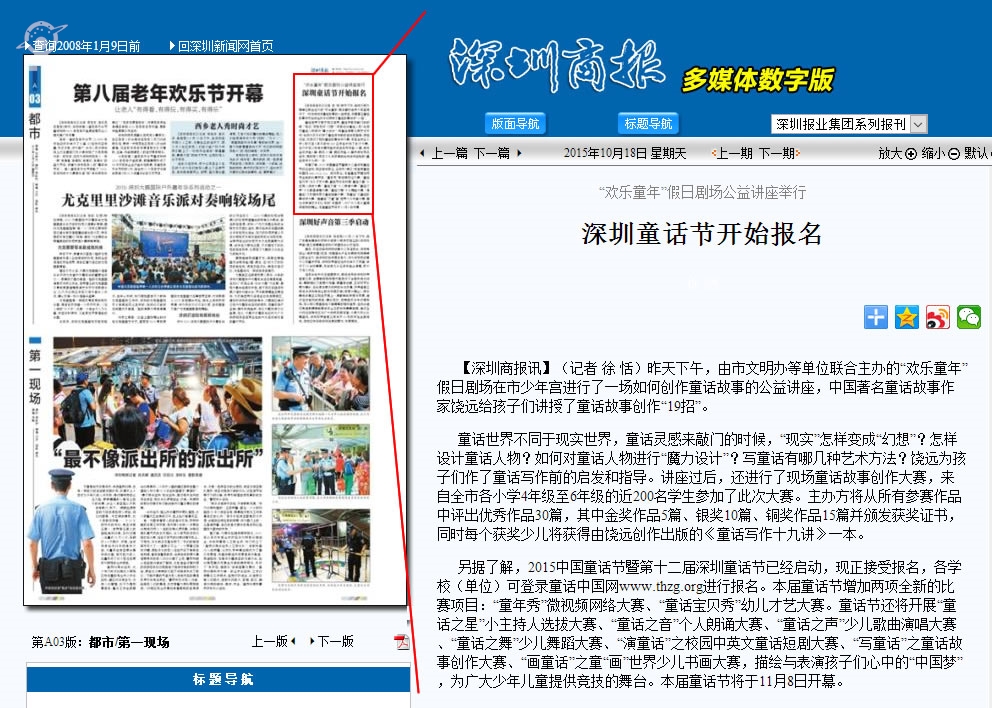 另据了解,2015中国童话节暨第十二届深圳童话节已经启动,现正接受报名,各学校(单位)可登录童话中国网www.thzg.org进行报名。本届童话节增加两项全新的比赛项目:“童年秀”微视频网络大赛、“童话宝贝秀”幼儿才艺大赛。童话节还将开展“童话之星”小主持人选拔大赛、“童话之音”个人朗诵大赛、“童话之声”少儿歌曲演唱大赛、“童话之舞”少儿舞蹈大赛、“演童话”之校园中英文童话短剧大赛、“写童话”之童话故事创作大赛、“画童话”之童“画”世界少儿书画大赛,描绘与表演孩子们心中的“中国梦”,为广大少年儿童提供竞技的舞台。本届童话节将于11月8日开幕。