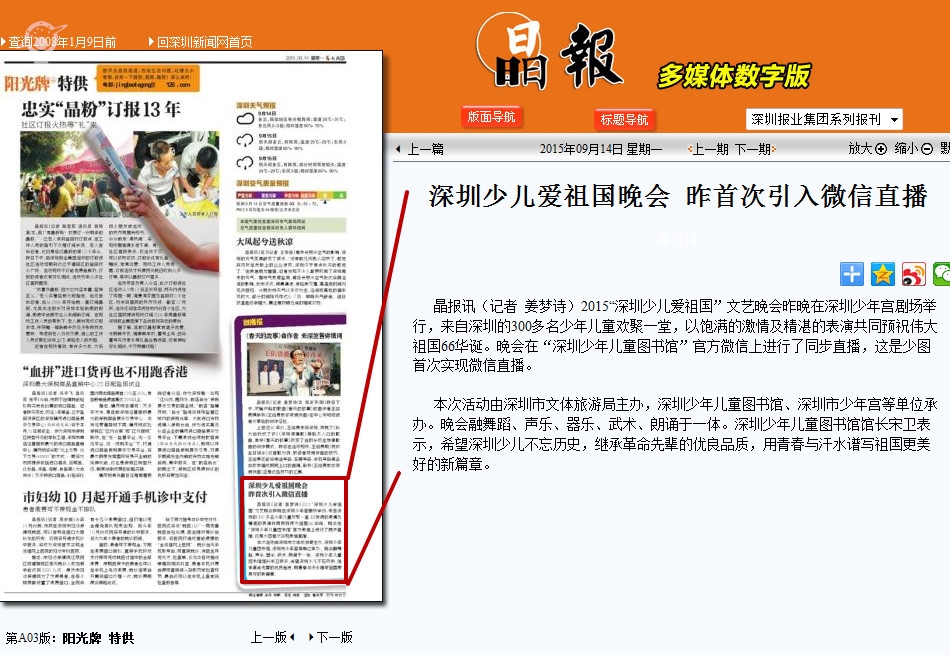 〖晶报〗深圳少儿爱祖国晚会昨首次引入微信直播