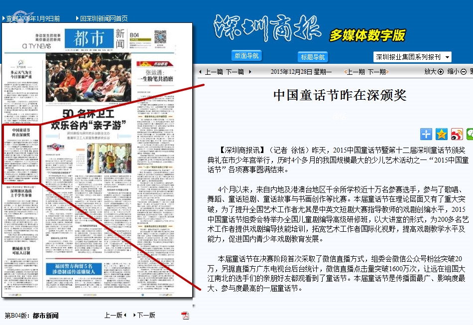 【深圳商报讯】(记者 徐恬)昨天,2015中国童话节暨第十二届深圳童话节颁奖典礼在市少年宫举行,历时4个多月的我国规模最大的少儿艺术活动之一“2015中国童话节”各项赛事圆满结束。