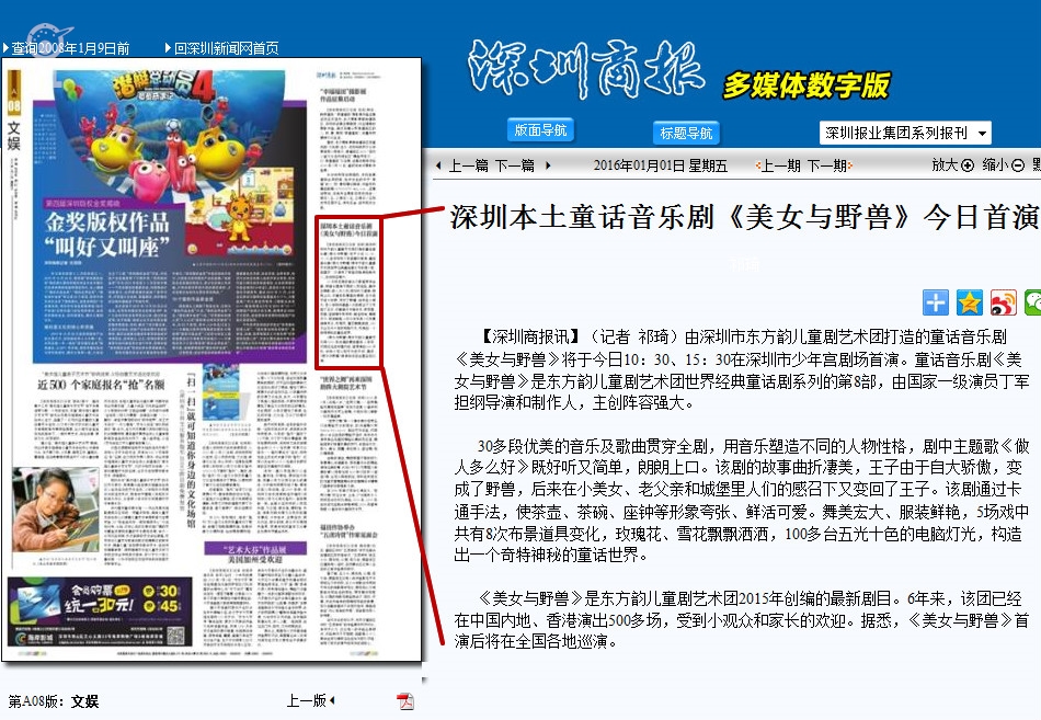 〖深圳商报〗深圳本土童话音乐剧《美女与野兽》今日首演