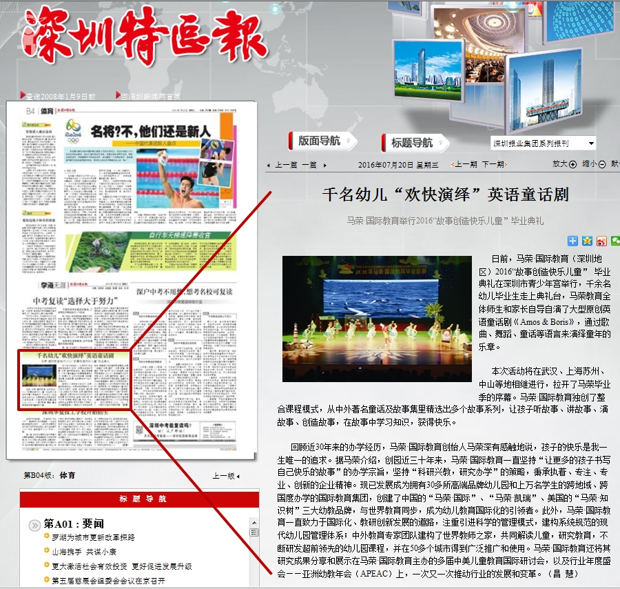 日前,马荣·国际教育(深圳地区)2016“故事创造快乐儿童” 毕业典礼在深圳市青少年宫举行,千余名幼儿毕业生走上典礼台,马荣教育全体师生和家长自导自演了大型原创英语童话剧《Amos & Boris》,通过歌曲、舞蹈、童话等语言来演绎童年的乐章。