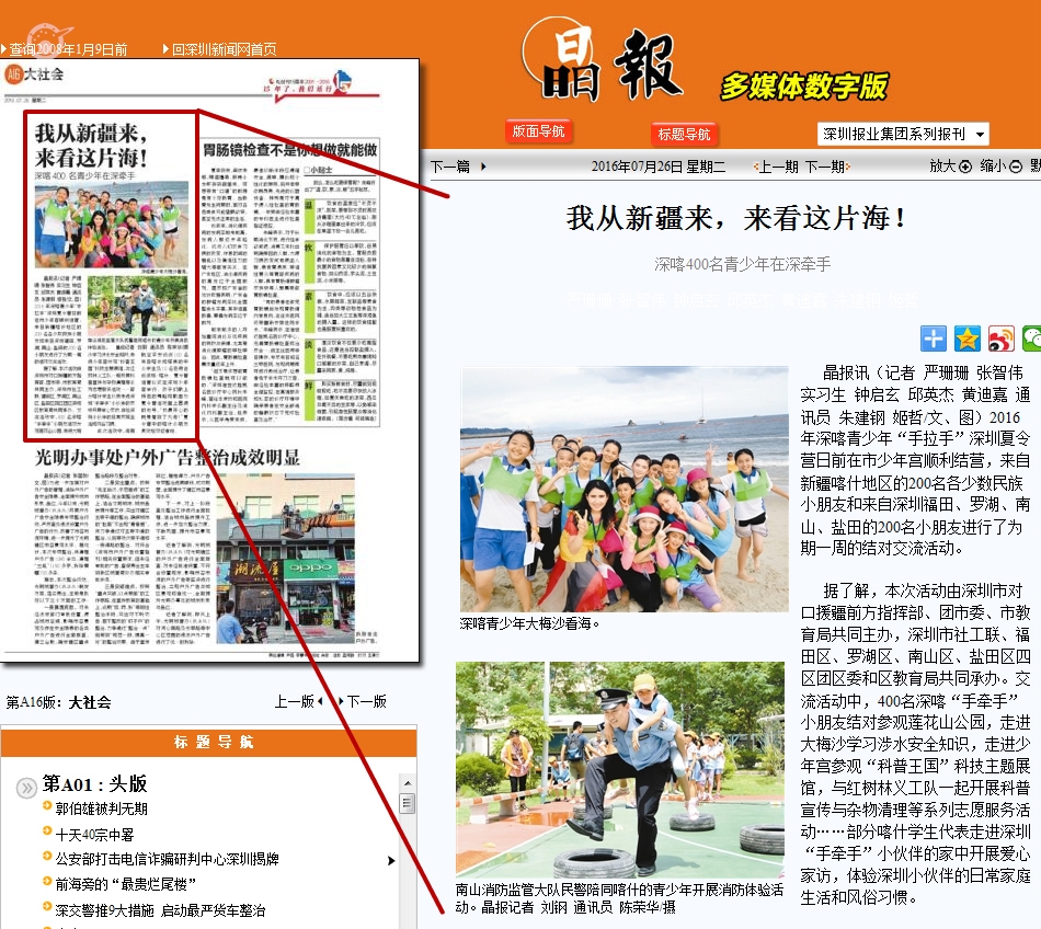 晶报讯(记者 严珊珊 张智伟 实习生 钟启玄 邱英杰 黄迪嘉 通讯员 朱建钢 姬哲/文、图)2016年深喀青少年“手拉手”深圳夏令营日前在市少年宫顺利结营,来自新疆喀什地区的200名各少数民族小朋友和来自深圳福田、罗湖、南山、盐田的200名小朋友进行了为期一周的结对交流活动。