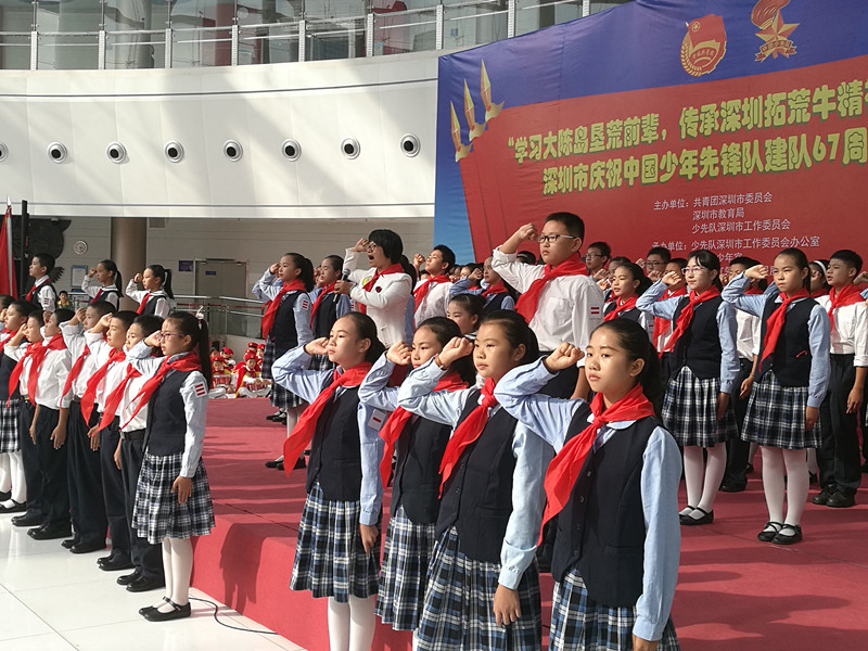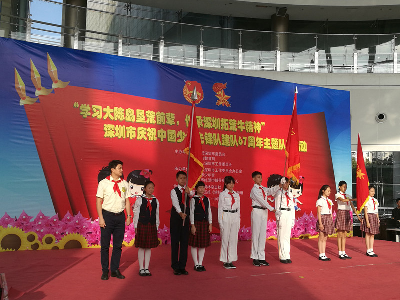 南都讯 记者晏婵婵 今日下午,庆祝中国少先队建队67周年主题队日活动于深圳市少年宫举办,活动以“学习大陈岛垦荒前辈,传承深圳拓荒牛精神”为主题,约400名少年队员代表参加。同时少年宫西广场正式被命名为“红领巾广场”。
