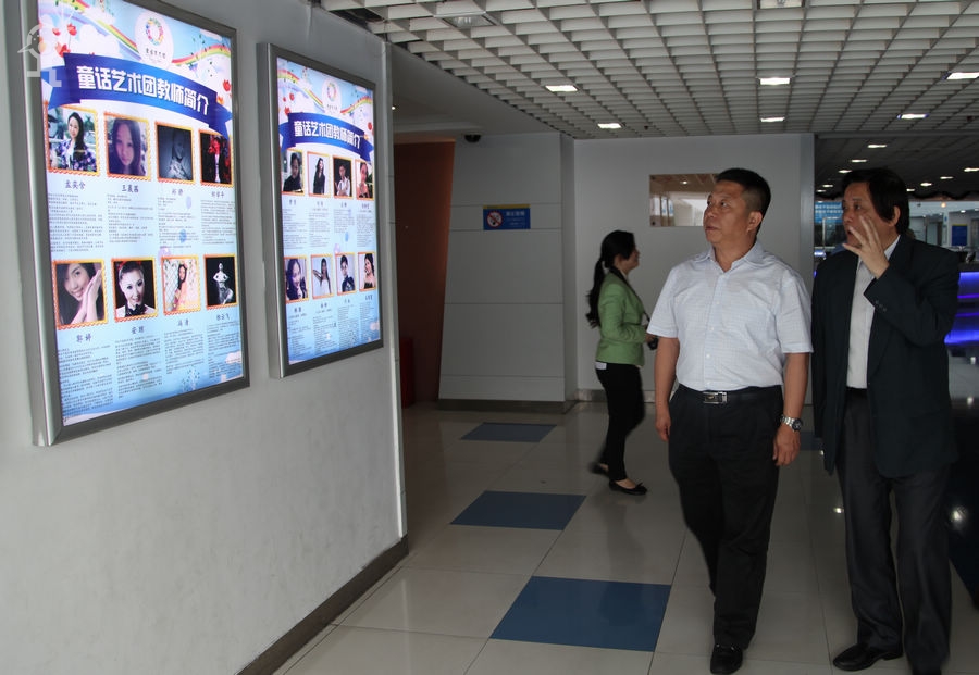 2014年4月11日上午,中国宫协党组书记许华平一行来到市少年宫参观调研,少年宫主任单协和、副主任王赐山、副主任王斌等接待了来访客人。一行人在座谈交流后,参观了少儿剧场、科技展馆、培训场所等处。