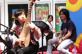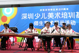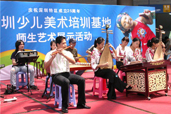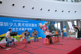 今天是暑假的最后一个周末,孩子们丰富多彩、快乐自由的假期生活即将结束,紧张而又繁忙的新学期就要开始。长河民乐团、深圳少儿美术基地的师生们纷纷聚集在少年宫的欢乐假期舞台上,用她们精湛的演奏技艺、厚实的美术功底,为前来少年宫的家长及小朋友们,献上了精彩、美妙的演出, 整个少年宫的水晶石大厅里荡漾着民乐雅韵,充溢着诗情画意。