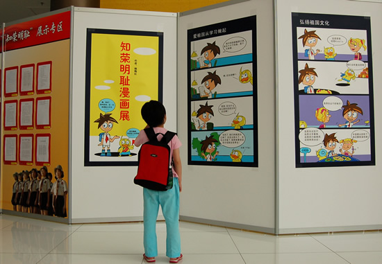 少年宫水晶石大厅还同时举办了“知荣明耻漫画展,以生动的系列动漫故事向少年儿童讲述社会主义荣辱观。另外,由众多动漫创作高手鼎力创作的“八荣八耻”连环画即将面世,同时,少年宫还将通过主题征文、社会实践、网上论坛等形式,对少年儿童开展丰富多彩的主题教育活动,把社会主义荣辱观的教育落到实处,引导所有少年儿童树立正确荣辱观,培养良好品质,健康快乐地成长。