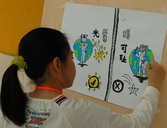 在此之前,少年宫已经围绕社会主义荣辱观,开展了如社会主义荣辱观网上知识竞赛、“八荣八耻”连环画创作活动、“知荣明耻,自我成长”学习活动周等一系列主题活动,务求以更多、更新、更容易让孩子接受的形式,在孩子当中进行社会主义荣辱观教育,取得了非常好的效果。据少年宫主任梁毅介绍,少年宫围绕社会主义荣辱观,针对少年儿童开展的主题教育活动,有两大显著特点:一是充分考虑了孩子们的内心真实意愿,融入了更多让孩子自主参与的元素。比如,领袖团的团员们通过深入学习后,自发组织起来,自主设计活动、撰写倡议书,自觉向身边的小朋友们宣传等就是一例。二是充分考虑了孩子的兴趣特点,采取了如漫画创作、知识竞赛等孩子感兴趣的方式进行教育,体现了寓教于乐的教育原则。
