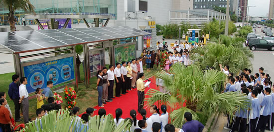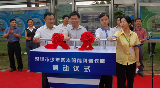 昨天是科普活动周的第一天。下午3点,“深圳市少年宫太阳能科普长廊并网发电启动仪式”在少年宫西广场举行。出席仪式的有团市委、市科协、省科协科普部、市少年宫等主、承办单位的领导以及各参与建设单位的领导和专家。各位领导、嘉宾与少年科学院的小院士共同为“太阳能科普长廊”推闸并网发电,点亮了两块户外LED显示屏。自此,市少年宫建设的又一开展青少年环保节能科普教育的专业场所开始全天候向广大少年儿童和市民免费开放参观。