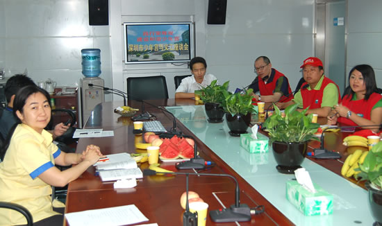 5月20日下午,在少年宫六楼多媒体会议室举行了“践行荣辱观,建设和谐少年宫”——深圳市少年宫与义工代表座谈会。少年宫党支部书记唐青、办公室主任蒋勇、展馆部长徐士斌、副部长唐萍及展馆部部分员工与前来的12名义工代表在热烈友好、轻松愉快的的氛围中,就践行荣辱观,建设和谐少年宫进行了座谈。