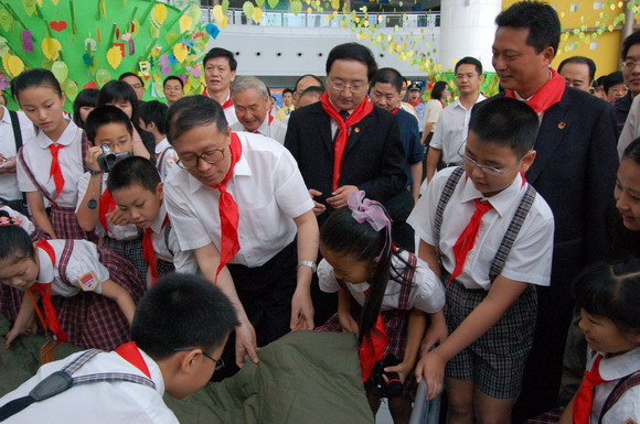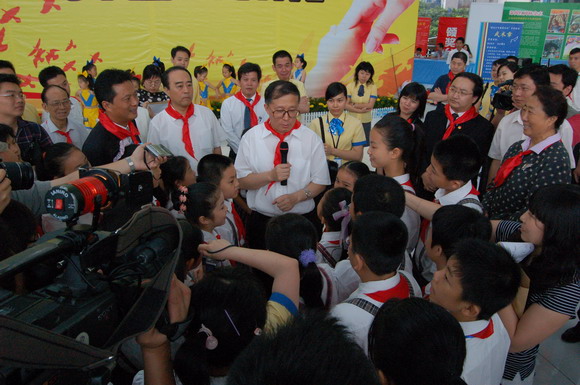 市委副书记白天为新入队的少先队员佩戴红领巾