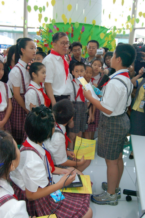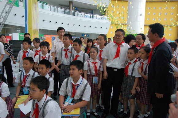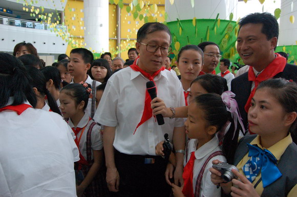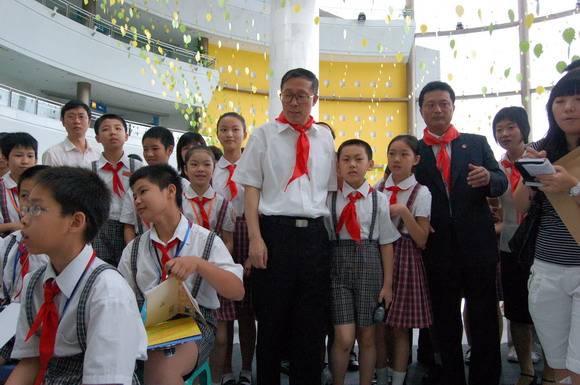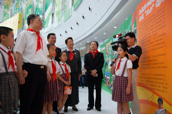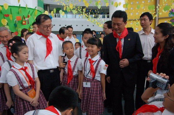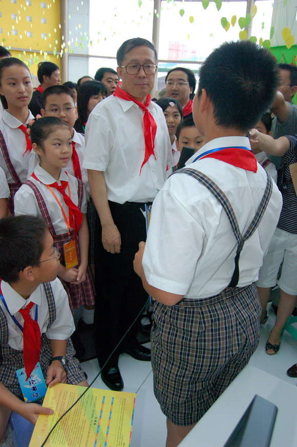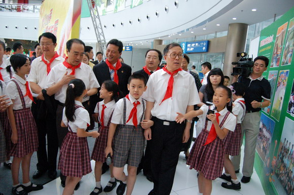 上午9点,李鸿忠一行冒雨来到少年宫。刚走进水晶宫大厅,孩子们立刻欢呼雀跃地围了上来,争相给市领导们戴上鲜艳的红领巾。拉着孩子们的手,在学生讲解员的带领下,李鸿忠等兴致勃勃地参观起了全市六区和各学校开展少先队活动的主题展板。