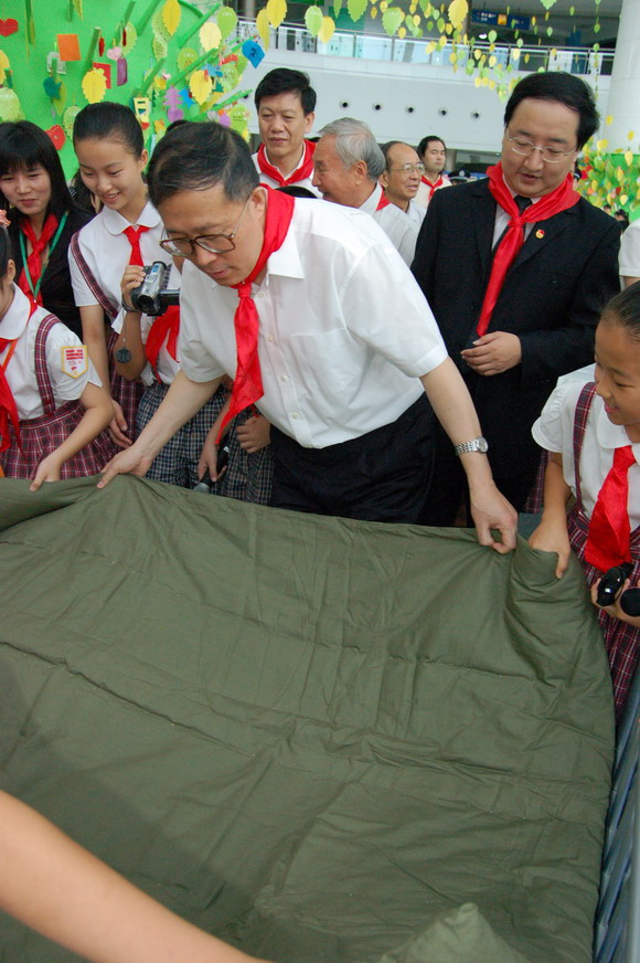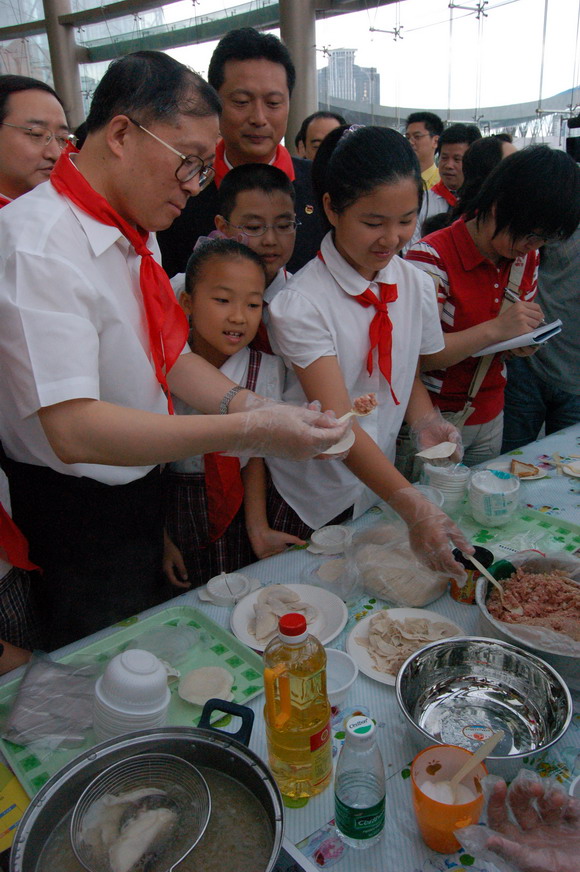 “武术章”、“小记者章”、“英语章”、“手工章”、“绘画章”、“发明创造章”……昨天的主题队日还安排了现场“雏鹰争章”活动,让少先队员在动手实践的过程中争取奖章,全面提升综合素质,这正是深圳素质教育中一个响亮的品牌活动。市领导们饶有兴致地观看了同学们的“争章”行动。在“自理章”、“烹饪章”的测试场地,李鸿忠还加入到他们的行列中,一边动手叠军被、包水饺,一边和孩子们亲切交谈。