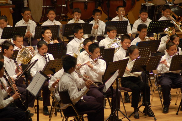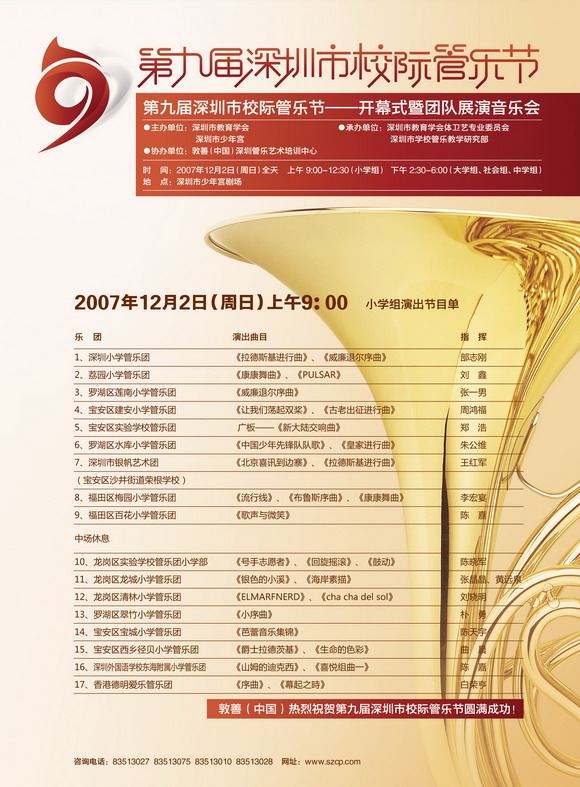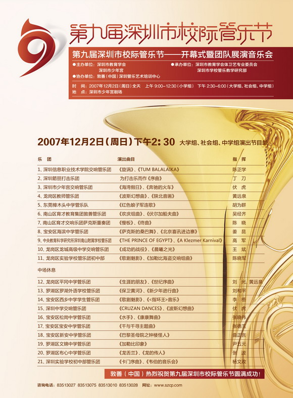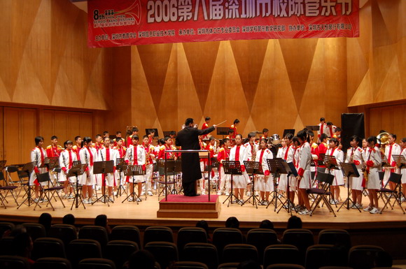 今年,第九届校际管乐节由深圳主要的校外教育机构少年宫主办,具有了特别的意义,它将为更多热爱管乐的老师和同学提供了表演、交流的平台,也为广大的爱好者提供了欣赏、学习的机会。本次管乐节,包括少年宫管乐团在内共有近四十支队伍参加,其中有小学、中学和社会团体,有本市的队伍,也有慕名前来参加的香港队伍。其中很多队伍曾经获得国内外各项大奖,如深圳中学交响管乐团在2004年维也纳的“第一届世界吹奏乐大赛”中获中学组金奖;深圳市少年宫交响管乐团在2006年美国的“第二届世界吹奏乐大赛”中荣获15岁以下组金奖;布吉中学在2005年西安“第三届西安国际管乐节” 荣获演奏金奖,同时,罗湖外语学校荣获演奏银奖与队列行进表演金奖;2007年的全国第二届中小学生艺术展演中,深圳市学校交响管乐团获中学生一等奖,深圳市龙岗实验学校管乐团获小学组一等奖等等。难怪来自龙岗的一位老师说,这么多优秀的团队互相交流和学习,一定能擦出很多的火花。