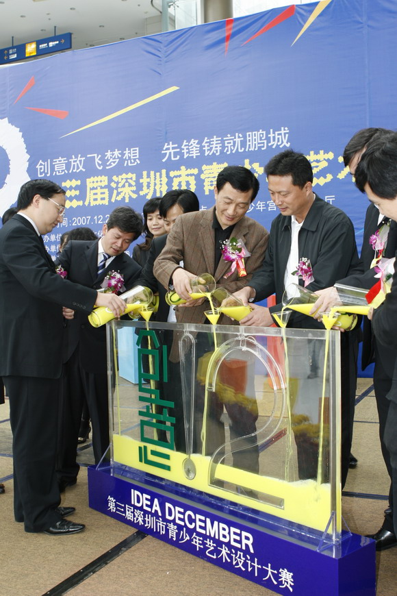 “第三届深圳市青少年艺术设计大赛”昨天在市少年宫隆重开幕,中共深圳市委宣传部、市文化局、团市委、教育局有关领导参加了开幕式。当嘉宾们将手中彩色的液体注入晶莹的容器中,绚丽的“创意12”渐渐显露出来,在礼炮齐鸣中绽放。这象征着灵感之泉源源不断流向充满活力和创意的深圳,使这座现代都市更充满激情和魅力。开幕式上,领导和嘉宾向获奖的作者颁发了证书和奖杯,鼓励他们在创意设计中取得的成绩。