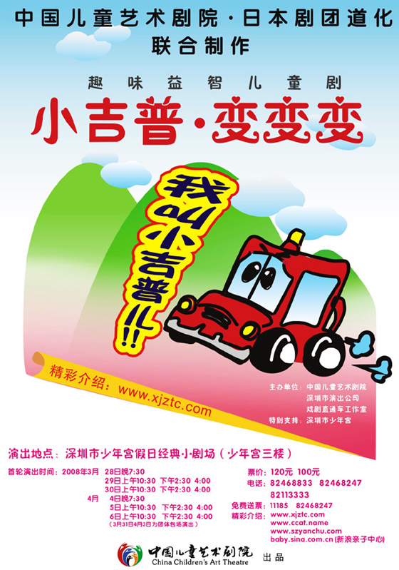 3月28日—4月6日,假日经典小剧场将迎来首轮演出,公演的剧目是中国儿艺与日本福冈道化剧团为庆贺中日邦交正常化35周年联袂推出的儿童剧《小吉普·变变变》。该剧去年5月在北京首演就达52场之多,各方面反应非常强烈。深圳是该剧全国巡演的首站。该剧第一部分《变变变》,3位年轻演员用香蕉、苹果、黄瓜、白菜、晾衣夹、刷子、碗和球等等日常食物和用品,变出大象、鸭子、鱼以及会耍杂技的小熊等等,奇妙的想象力和创造力让大小观众大开眼界;第二部分《消防车·小吉普儿》,讲述一辆消防小吉普如何成为一名救火小英雄的故事。3位多才多艺的演员连演带跳,配合默契,就连成人观众也看得津津有味,大呼过瘾!该剧导演筱崎省吾先生说:“我相信从日本福冈带来的这颗小小的种子,会飞到中国各地,开出五颜六色的美丽花朵!”