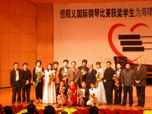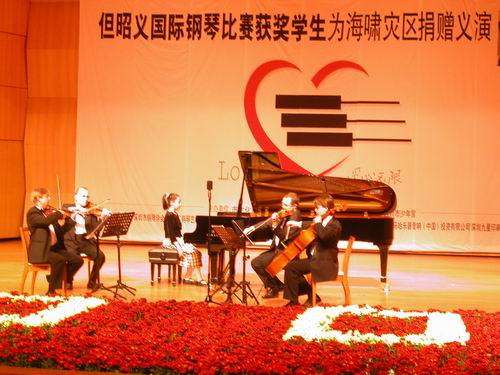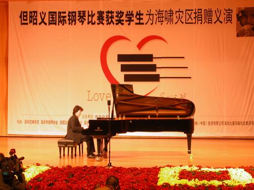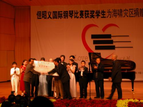 今日下午,深圳市少年宫剧场琴声飞扬,爱心涌动,能容纳700余人的观众席座无虚席。左章、张昊辰等8位但昭义弟子,联手举办了一场“但昭义国际获奖学生为海啸灾区捐赠义演”,李云迪获悉此消息,专程从香港赶到了演出现场,参加了师兄妹们的“爱心行动”。义演共筹集10万元门票收入,全数委托市慈善会捐献给印度洋灾区。