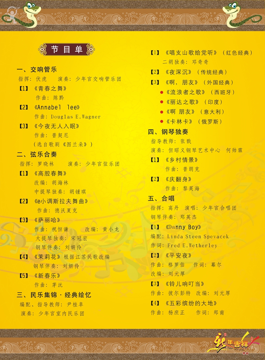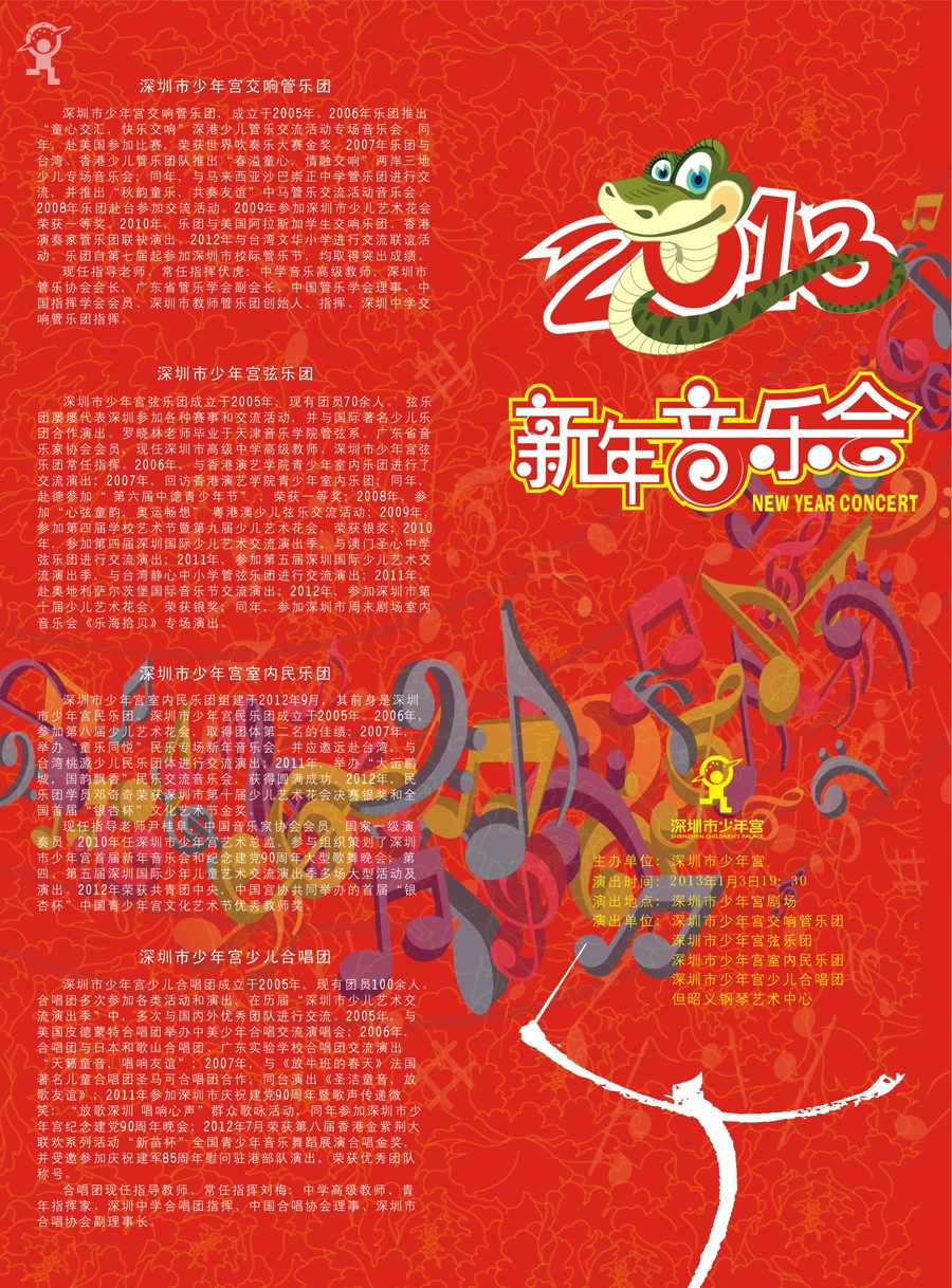 2013新年即将来临,市少年宫将于元月3日晚举办“深圳市少年宫2013新年音乐会”。音乐会涵盖管乐、弦乐、民乐、钢琴、合唱等类别,演出团队包括市少年宫管乐团、弦乐团、民乐团、合唱团和但昭义钢琴艺术中心,他们将为观众演奏(唱)近二十支中外经典曲目。