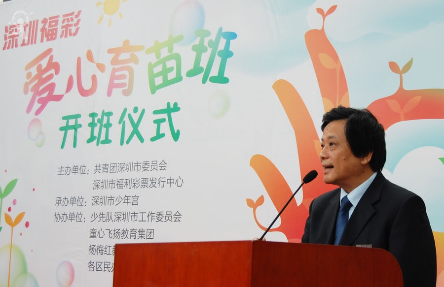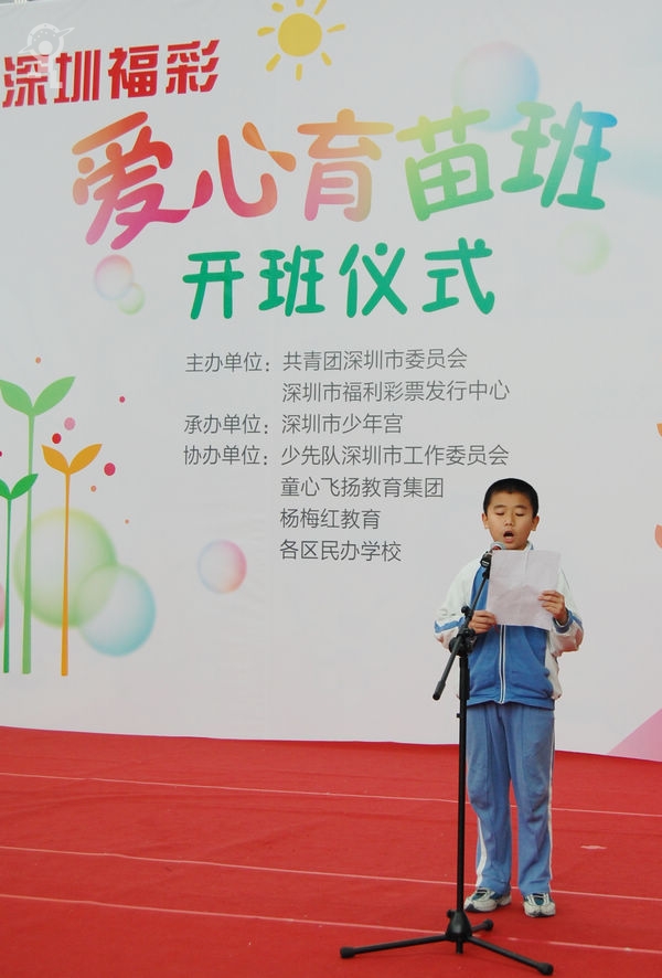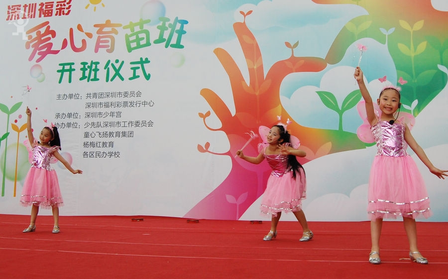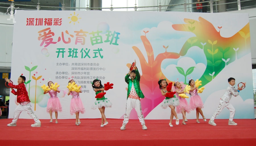 为帮助我市生活困难少年儿童健康成长,根据团省委、省福利彩票发行中心、省青少年宫协会联合下发的《关于实施“广东福彩爱心育苗计划”的通知》精神,团市委、市少工委、市福利彩票发行中心与市少年宫于2013年春季联合举办了“深圳福彩爱心育苗班”。该班由市少年宫协调相关教学机构赞助20%学费,其余80%学费由市福利彩票发行中心捐助,团市委、市少工委统筹协调招生工作,少年宫承担具体开班任务。来自福田区、罗湖区、南山区、龙岗区相关民办学校的125名困难家庭的青少年,将免费在少年宫参加中国舞、声乐表演、语言表演、美术绘画等5个班的学习培训。