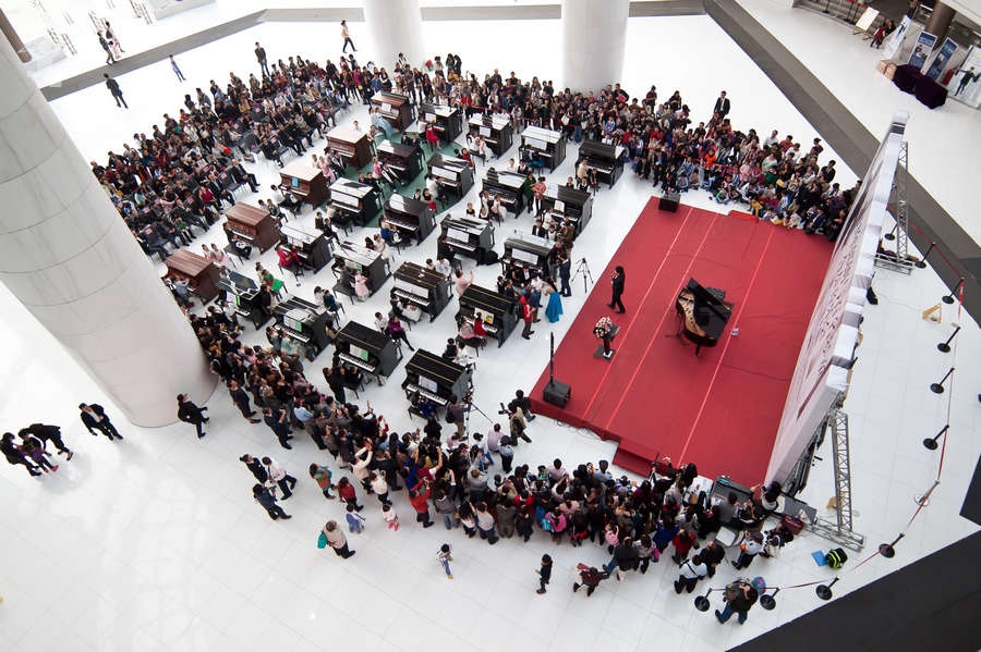 50架立式钢琴、1架施坦威三角钢琴以及100名琴童,在深圳再次以庞大的钢琴阵容出现在市少年宫水晶石大厅。当天下午2点,琴童们在老师的指导下进行彩排和练习;4点全球著名钢琴家郎朗来到现场,便立刻穿梭在这庞大钢琴阵容中,耐心地为兴奋的孩子们进行指导,回答孩子们提出的问题,帮助孩子们克服学琴正碰到的困难。随后,演出正式开始,琴童们在郎朗引导的节奏下合奏演出,《军队进行曲》激昂的音符在郎朗与琴童们的指尖抑扬顿挫地跳跃,全场响起震撼人心的旋律,如波涛汹涌,令全场沸腾。
