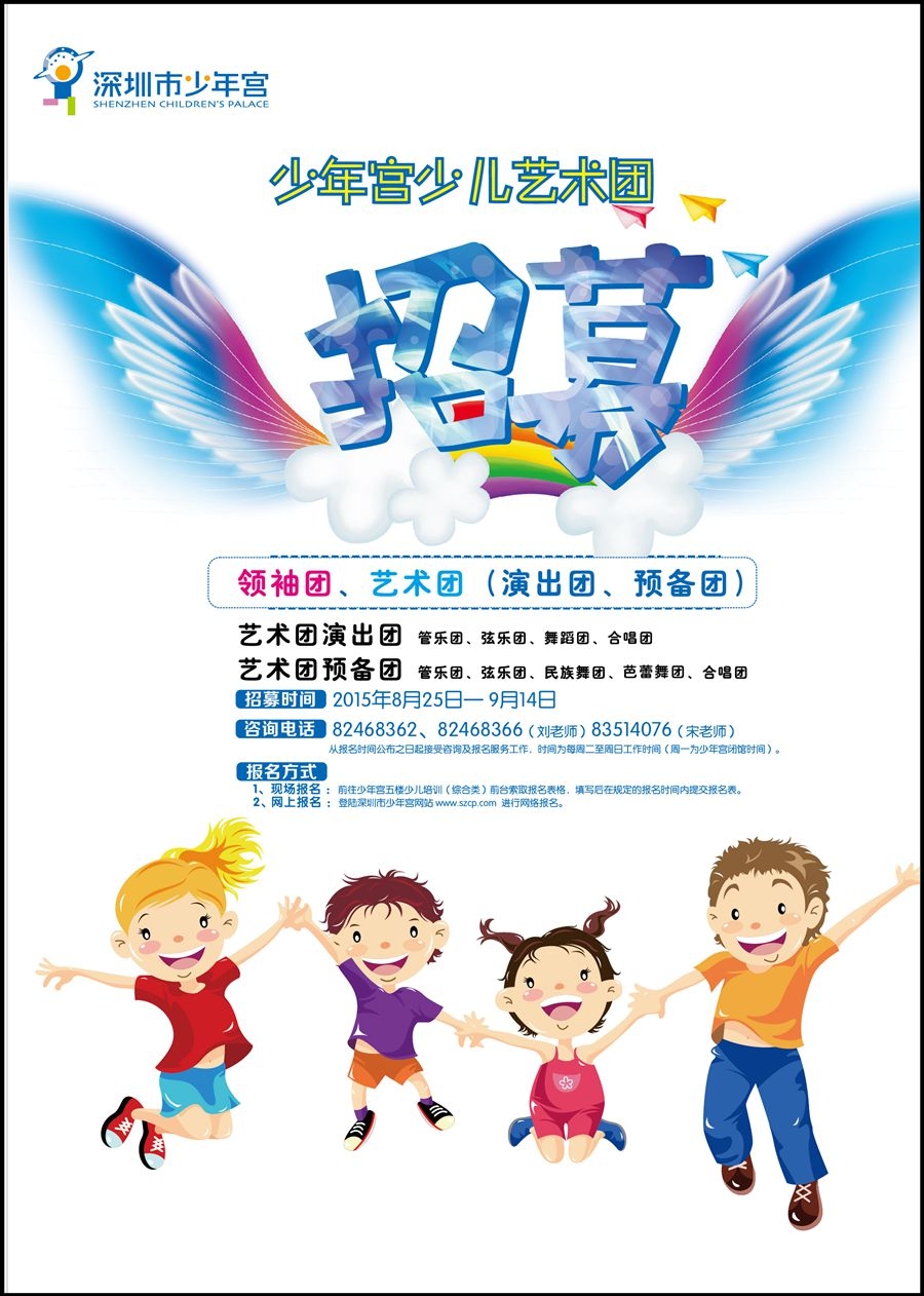 一年一度的深圳市少年宫艺术团和领袖团的秋季团员招募工作已于8月25日正式启动,报名时间为8月25日——9月14日。少年宫团队致力培养和挖掘全市高素质、高水平、有特长的少儿艺术人才,为他们提供一个展示艺术才华的舞台,凡有艺术特长或领袖才能的中小学生,均可登录少年宫网站m.bnq8.com或前往少年宫现场报名,凡入选成为艺术团演出团和领袖团团员者,一律免费参加、排练和演出,并有机会代表深圳市参加国内外的演出、交流及重大比赛活动。