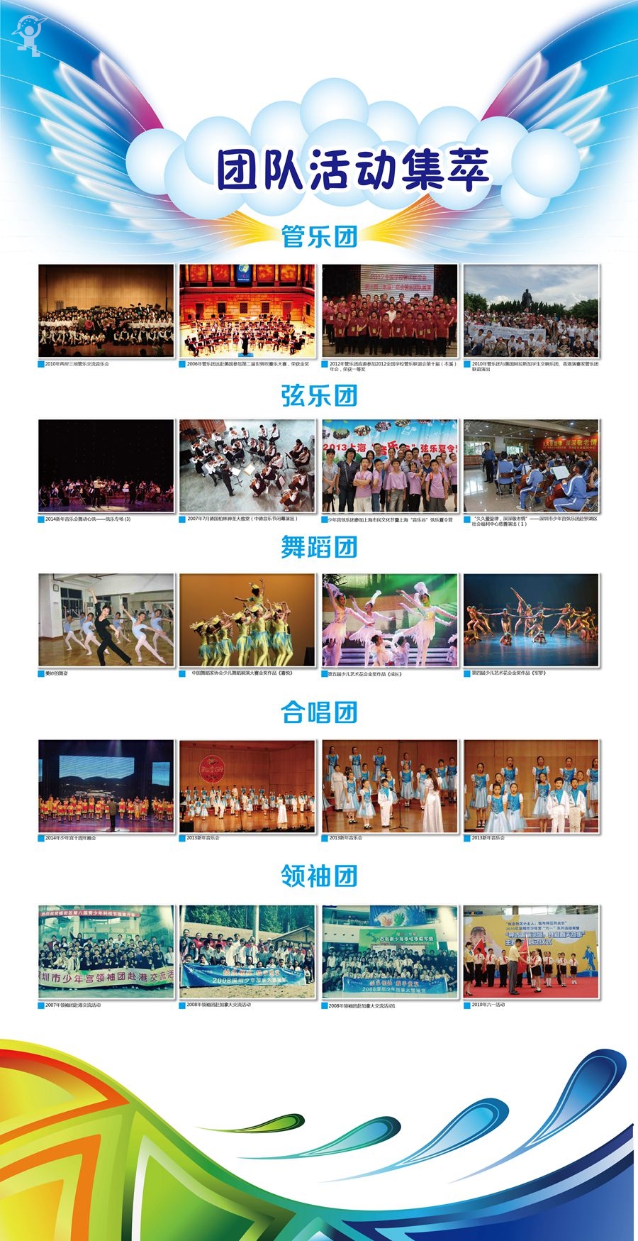 市少年宫艺术团成立于2005年2月,十年来,已发展成为一支高素质高水平的艺术团队,成为培养各类少儿艺术人才的摇篮,长期以来,倍受业界和社会关注。少年宫艺术团不仅拥有先进的教育理念,一流的活动设施,还聘请了一级的导师和指挥,吸收了深圳最优秀的少儿艺术人才,为孩子们提供广阔的艺术展示平台。