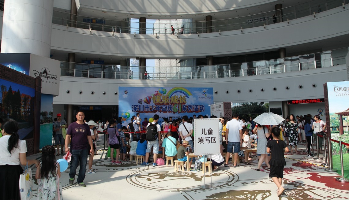 5月28、29日, 六一儿童节前夕,深圳市少年宫的水晶石大厅俨然成为了一片欢乐的海洋,洋溢着热烈的节日气氛。在这里,深圳市少年宫与香港迪士尼乐园合作,举办了为期两天的亲子嘉年华活动。活动以“探索”为主题,在水晶石大厅中央区域设置了“迪士尼朋友”、“漫威超级英雄”、“探索家大召集”、“主题园区配对”、“探索奇妙骰”、“填色游戏”等六大不同主题的游戏区。喜闻乐见的游戏项目吸引了众多小朋友和家长的热情参与,孩子们在在迪士尼玩偶的陪伴下共度了端午节假期的快乐时光,并提前感受了六一儿童节的快乐氛围。