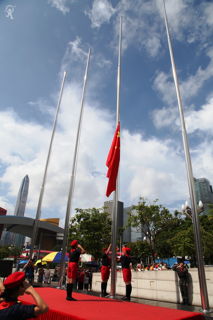 迎着朝阳,来自福田区教科院第二附属小学的升旗队伍护送国旗来到国旗旗杆前,在将国旗抛向天空的瞬间,广场上近千名群众肃穆地抬起头,全神贯注地凝视着国旗行注目礼,口中大声齐唱雄壮激昂的国歌,在一片爱国热情澎湃的气氛中,五星红旗缓缓升起,在蓝天白云下迎风飘扬。