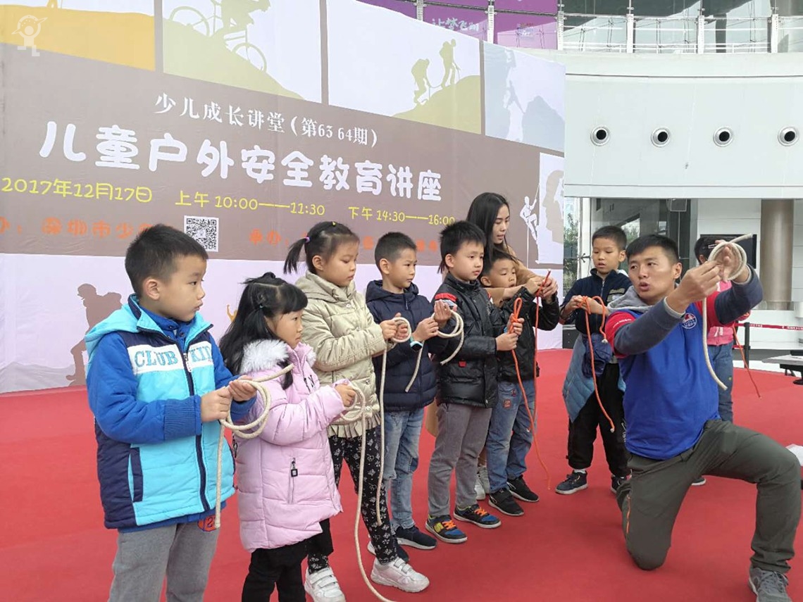 此次讲座的主讲嘉宾是前东南战区百人突击队队员、具有五年特种兵军旅生涯的谭教官。谭教官退役后一直从事青少年户外拓展、户外急救和户外生存的课程活动,他在现场图文并茂地讲解攀岩、溜索、露营、探洞等有趣的户外活动项目,并教给孩子们一些实用的野外求生技能,如野外失血的处理、一根绳子的循环使用、野外生火等。谭教官在现场展示了一些在野外生火的工具,并演示了如何利用“镁棒”进行摩擦生火,孩子们都兴致盎然,跃跃欲试,在互动环节邀请了几组小朋友上台亲自实践,孩子们玩得特别开心,并在挑战成功后和大家分享了心得体会。“当在野外遇到危险,你如何用一根绳子进行救援?”在教官的提问之后,孩子们在台下都积极踊跃地举手,争先恐后地回答。谭教官将绳子发到孩子们手上,在现场手把手地教孩子们如何打坚实的绳结进行自救,并进行了“打绳结”比赛,胜出的孩子还获得了小礼品。孩子们在这种饶有趣味的活动中学到了户外生存的本领,受益匪浅。