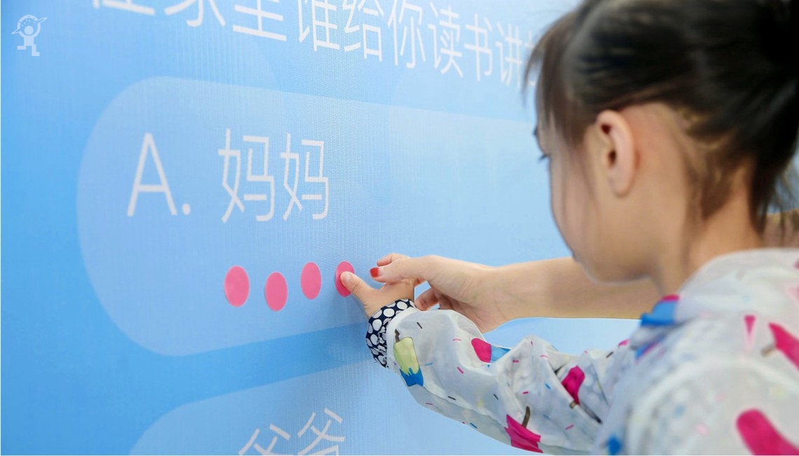 调查墙上两条最简单的调查问卷:由家长作答的问题为家庭亲子读书时长调查。由孩子回答的问题为亲子读书中,爸爸妈妈所担负的责任状况了解。活动方准备了不同颜色的贴纸,供参与调查的家庭在答案栏中作单一选择,以便直观地展示调查结果,引起家庭关注。