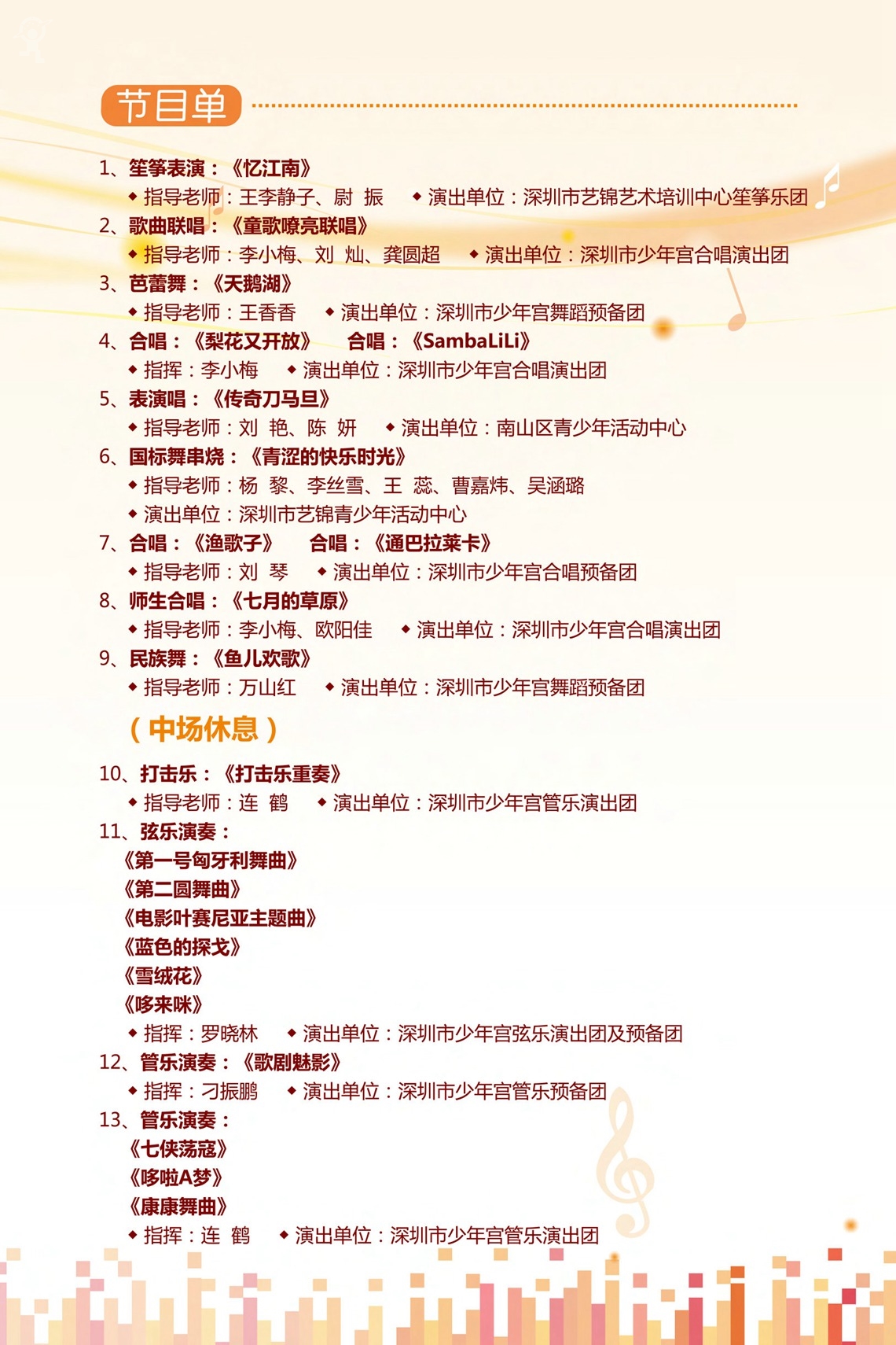 本届新年音乐会共有12项节目,参加演出的除了少年宫少儿艺术团的学员外,还特别邀请了深圳市校外教育协会的成员单位南山区青少年活动中心、深圳市艺锦艺术培训中心、深圳市艺锦青少年活动中心、童心飞扬教育集团参与演出,他们将带来在深圳市第五届青少年科学与艺术节艺术展演中的优秀参演节目。