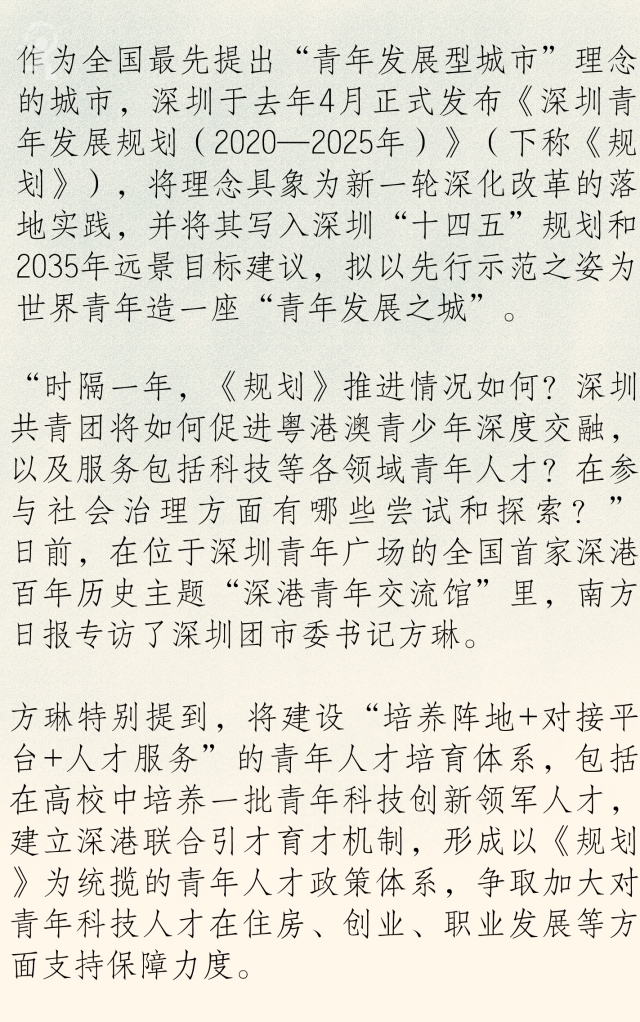 南方日报:去年初,深圳市委、市政府出台了《深圳青年发展规划(2020—2025年)》。前不久,团市委提出“为世界青年造一座‘青年发展型城市’”。目前规划的实施情况如何?有哪些新的计划?
