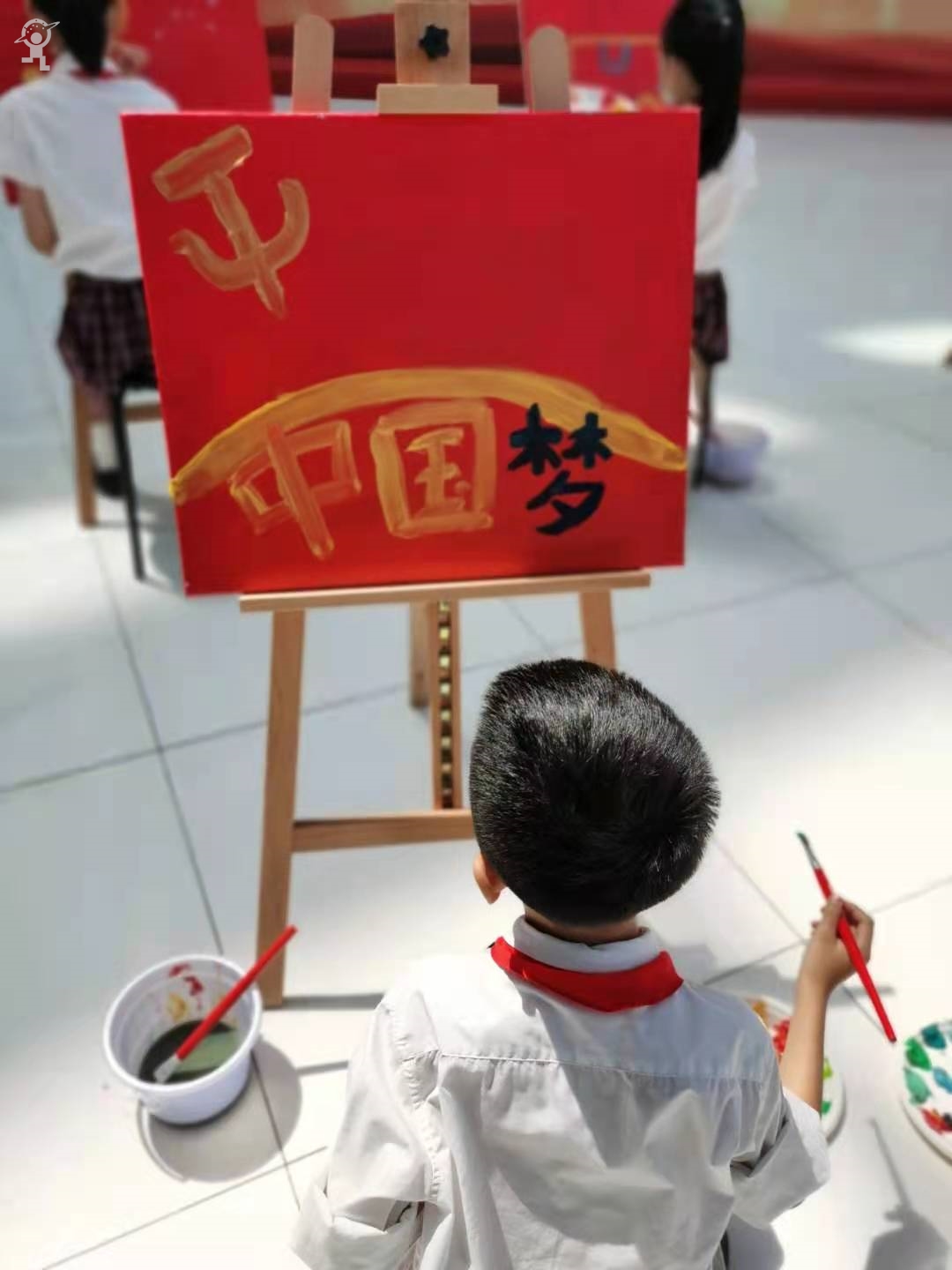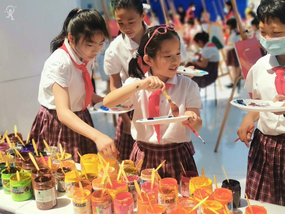 讲座结束后,100名少先队员在100块画板上共同挥动画笔,铭记党史,写意精彩生活,描绘美好明天。活动现场,每一名少先队员都精神饱满、创意无限,用手中的画笔抒发心中美好的情感,为党的百年华诞送上诚挚的祝福。现场绘画完成的作品悬挂在少年宫水晶石大厅背景墙上组成一面巨幅画作,为建党一百周年呈献一份独具匠心的贺礼。