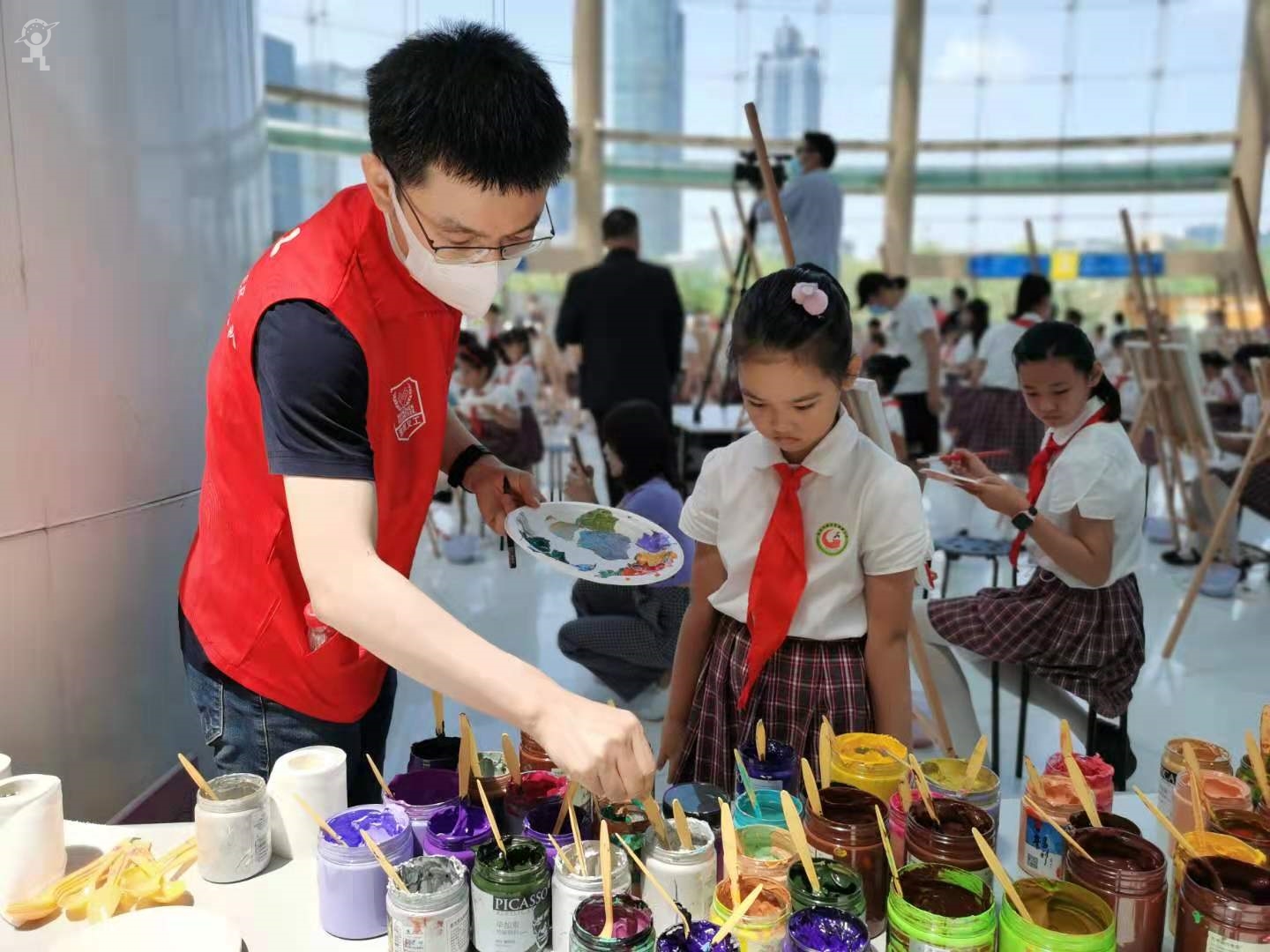4月24日,100个画架布满了市少年宫水晶石大厅,由团市委、市委党史文献研究室(市史志办)、市少工委共同主办,深圳市杨梅红艺术教育集团有限公司协办,市少年宫承办的“红领巾心向党 童心共绘庆百年”现场绘画活动拉开帷幕,让青少年与党史学习实现“共振”。