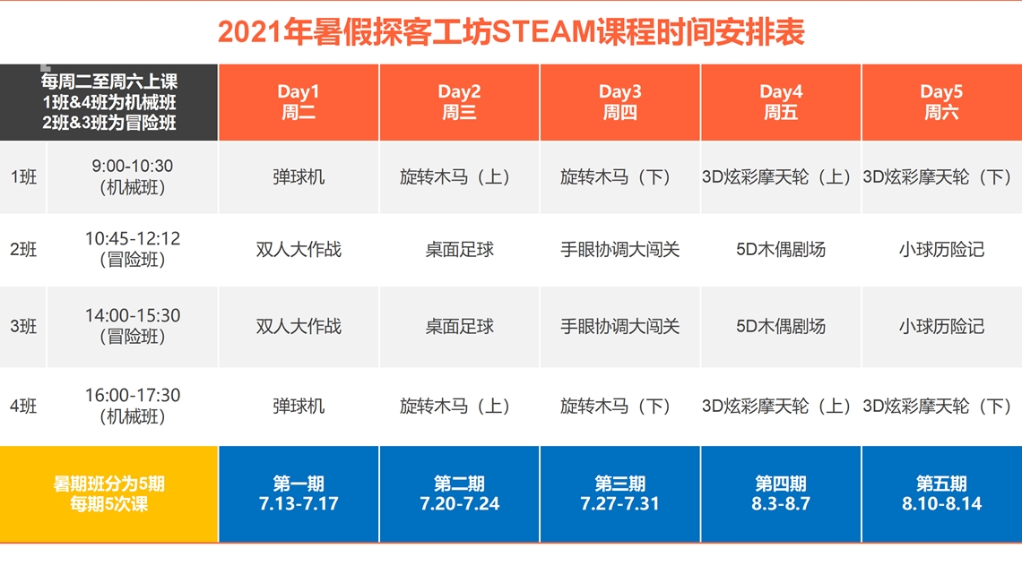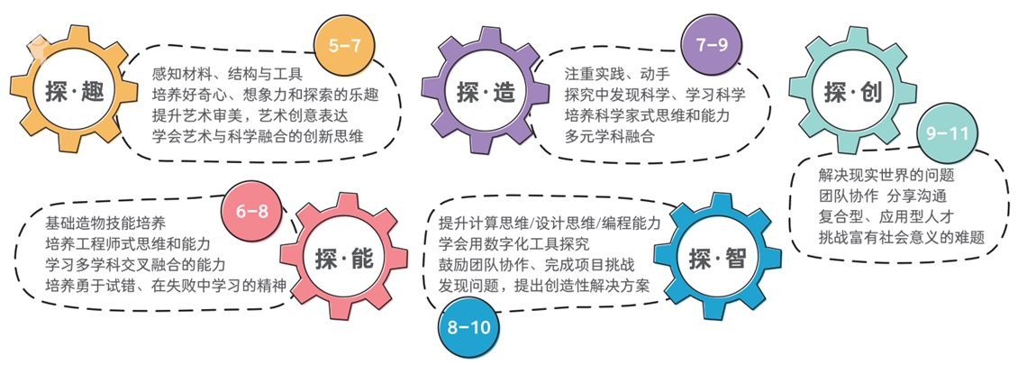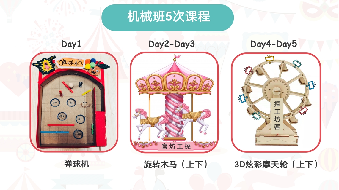 探客寄语:在5天的沉浸式学习中,老师将会协同“小小探客工程师”们通过自我探究式学习,在动手创造中,体会工程师的烧脑与严谨,在创建小小游乐园的过程中,探索机械的奥秘,了解力学、光学、齿轮传动等知识,用技术工具和科学原理表达自己的艺术观点、提升逻辑思维能力及培养解决问题的能力。