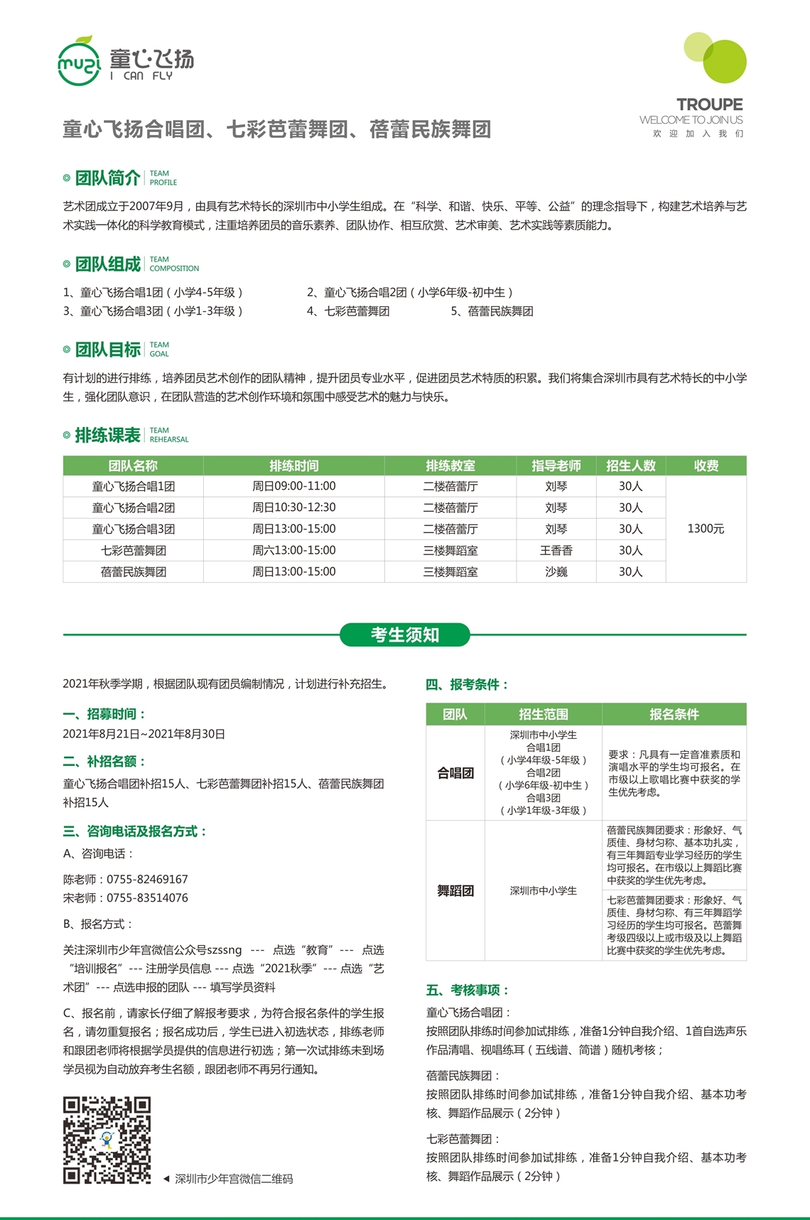童心飞扬合唱团、七彩芭蕾舞团、蓓蕾民族舞团简介及报名方式等详见以下图片,点击可观看大图。